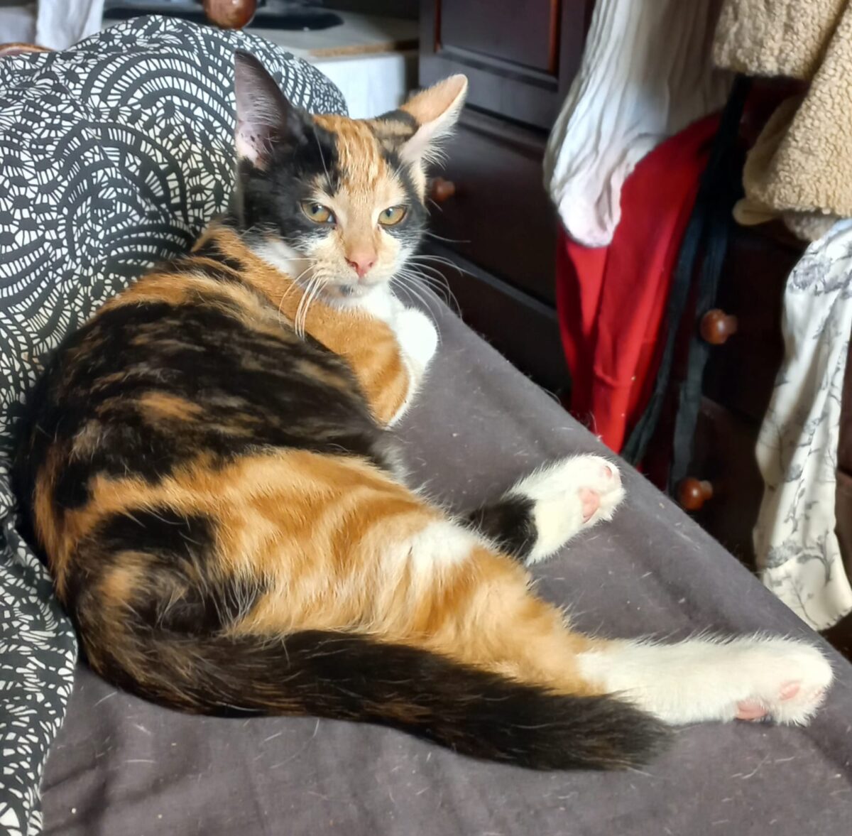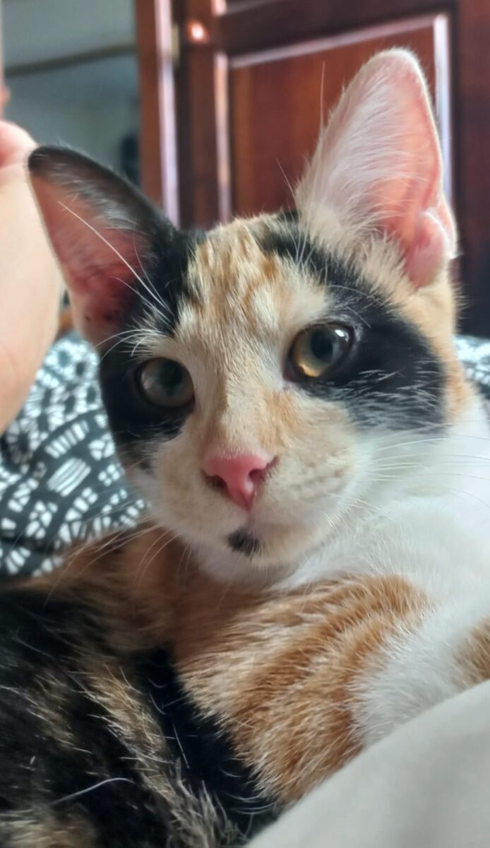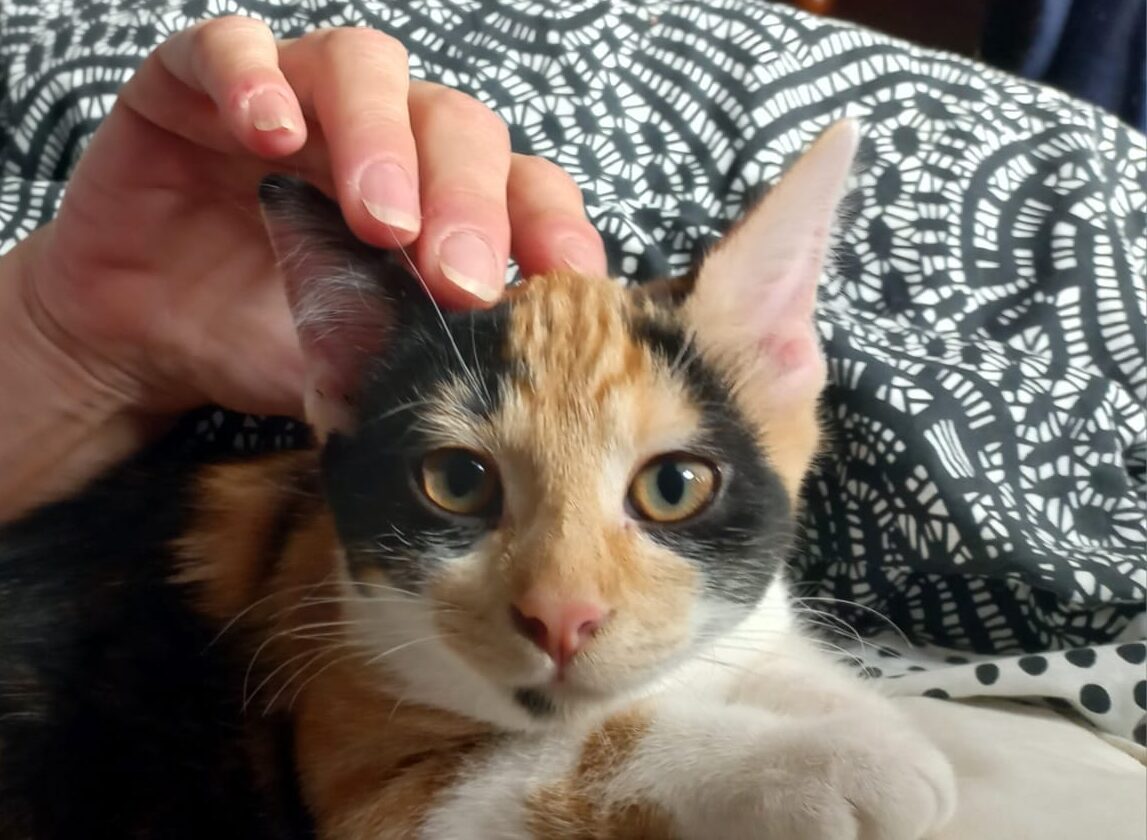 Accueillie avec son frère Gouda, Mimolette est une chatonne pleine de vie : très joueuse mais aussi incroyablement câline. Un peu réservée au départ, elle se transforme rapidement en véritable boîte à ronrons une fois en confiance. Elle adore donner des petits bisous, surtout la nuit !