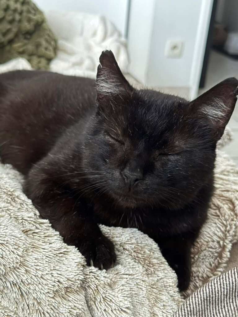 Blacky est un magnifique chat noir, très demandeur d’attention et de présence. C’est un gros matou câlin et joueur qui adorera monter sur vos genoux et se prélasser sur vous lorsque vous serez sur le canapé (un vrai pot de colle !).
