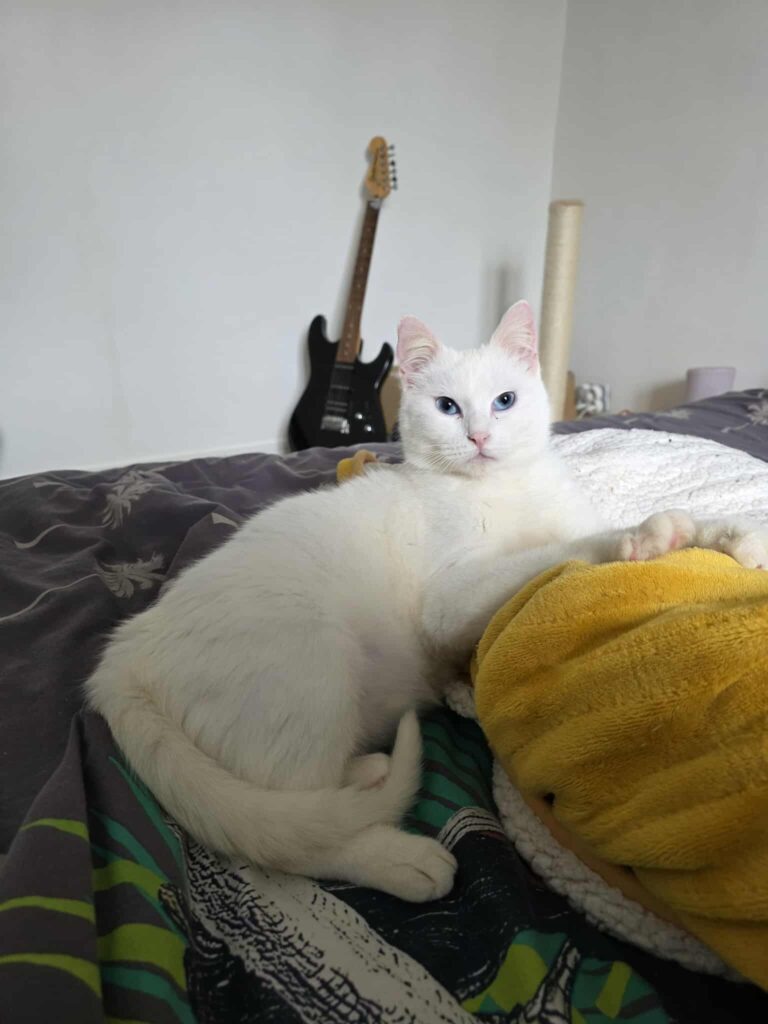 Au premier contact, Flocon peut se montrer craintif. Il a malheureusement été maltraité par d’autres chats avant son arrivée, ce qui explique sa prudence. Mais derrière cette réserve se cache un chat très attachant, en demande d’interactions et de jeux avec l’humain. Il apprécie les moments de complicité avec l’humain et peut, dans l’enthousiasme du jeu, un petit peu mordiller la main sans jamais faire mal. C’est un petit cœur très respectueux, qui ne sort pas les griffes.